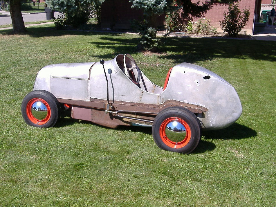 Years ago, when my grandfather moved out of his big, old house, I was able to talk him into letting me drag the old midget race car out of his crawlspace and take it home. Click here for more information about the history of the midget itself.