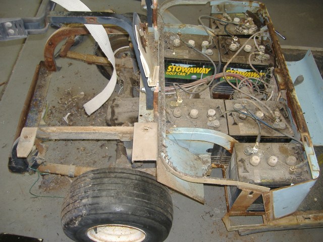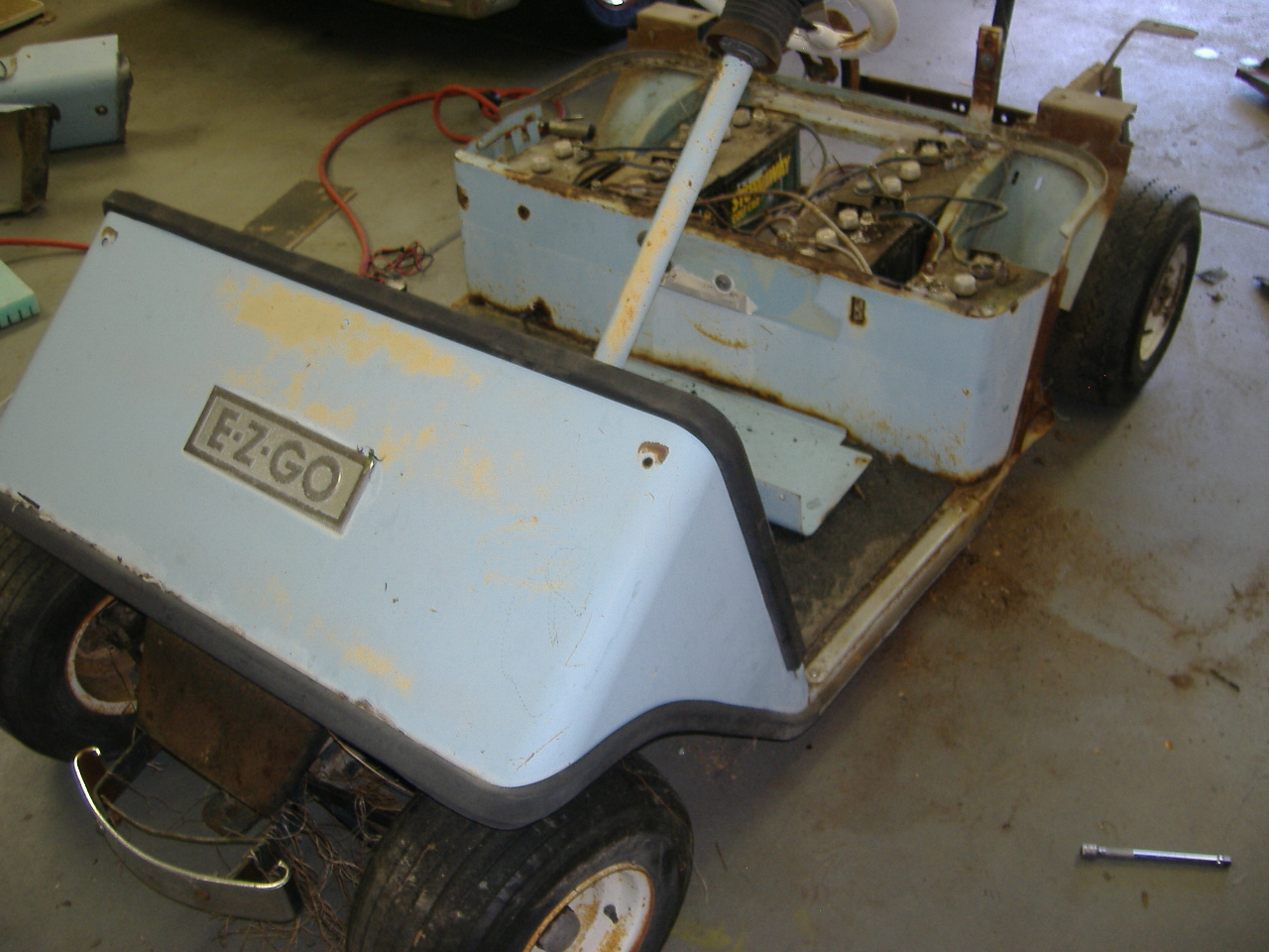 My dad had been keeping an older E-Z-GO golf cart in his back yard for several years. He had parked it when the batteries died, not wanting to spend the money on new ones. He told me I could have it. So, with the help of my friend Sam, I dragged it up on a trailer and brought it home. Then, the harvesting began.