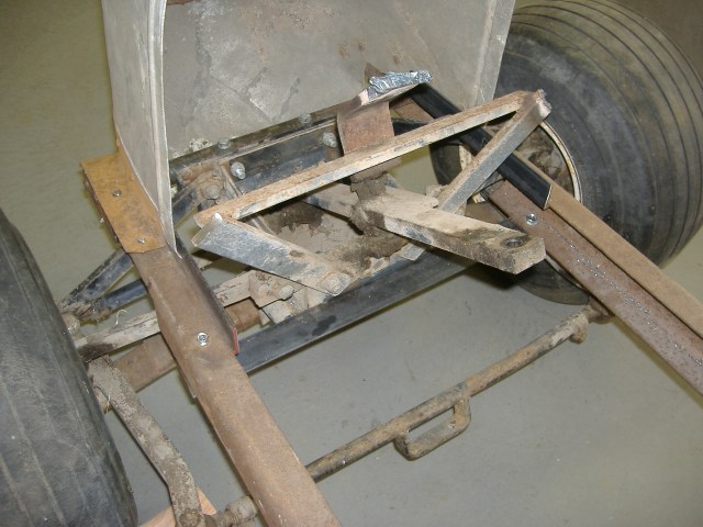It wasn’t low enough, so we notched the frame rails and gained (or lost) about 2″ of ride height.  The frame was reinforced with angle iron.  The steering/suspension box is bolted to the front spreader tube and to another angle iron cross member at the back of the box.