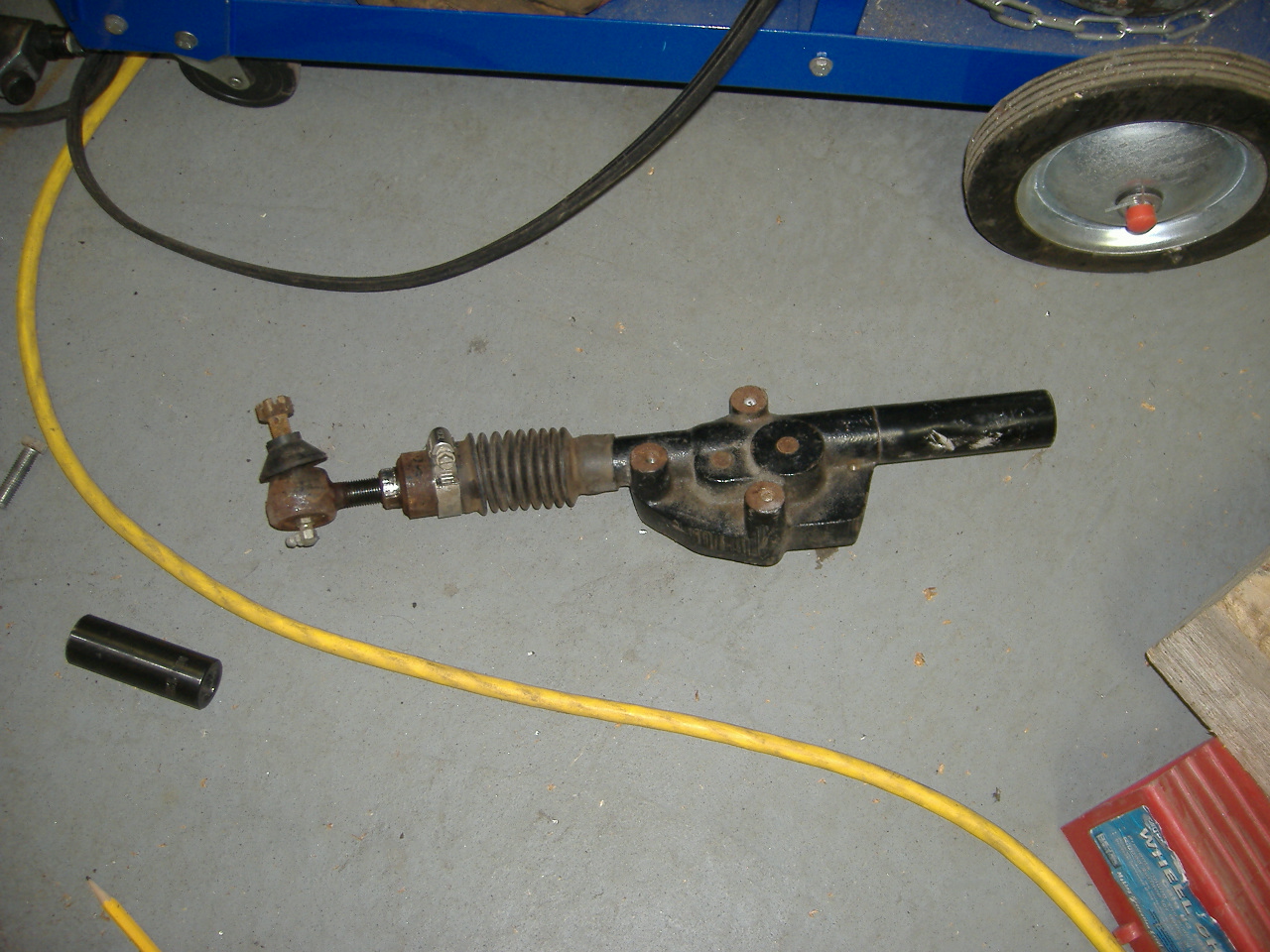 So with the suspension box mounted solidly, we all we needed was steering.  Grandpa, having worked with the city Parks and Recreation department, had saved a bunch of golf cart parts along the way.  One was an extra steering rack:
