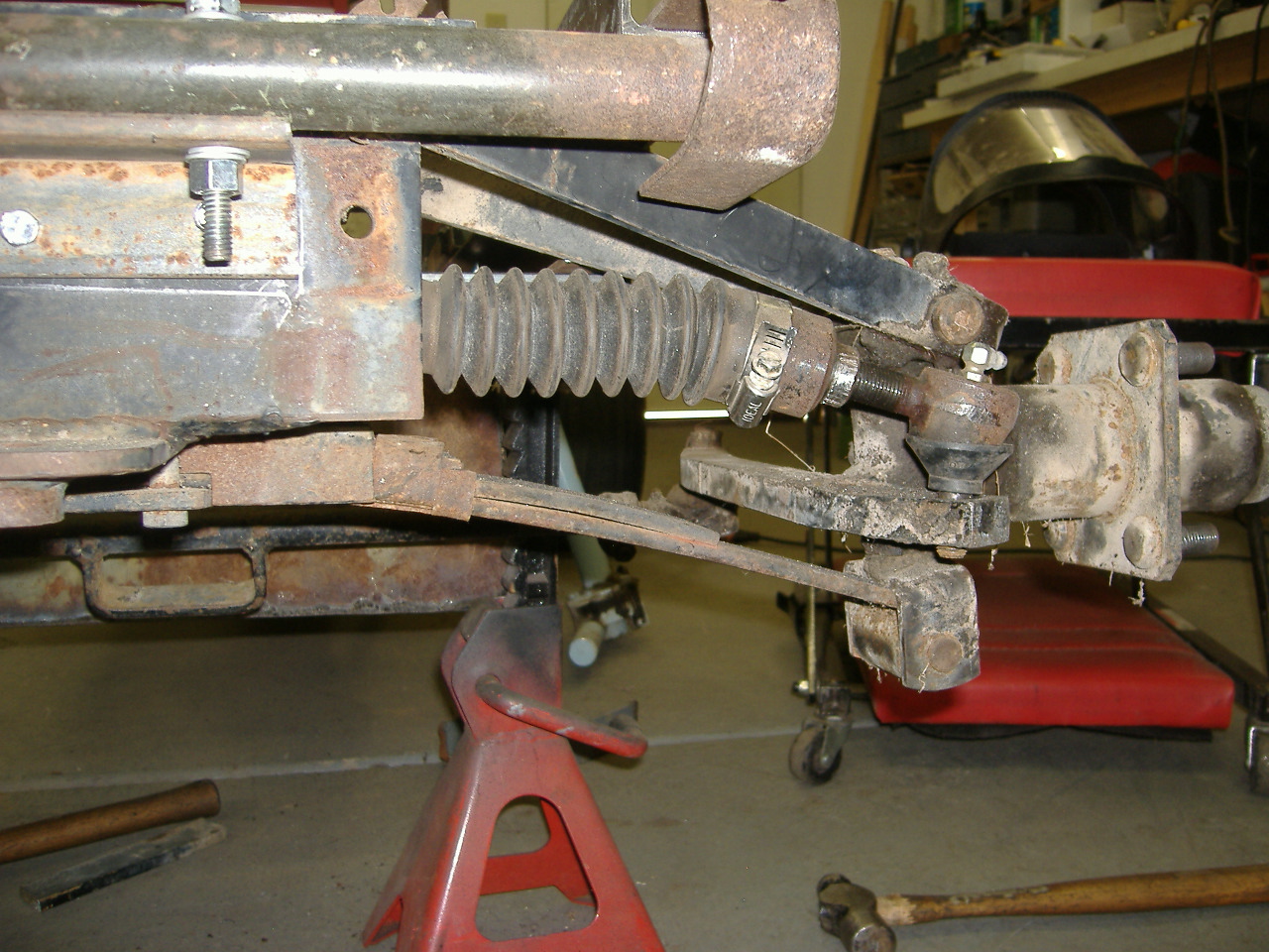 However, in setting up the above mock-up, I discovered that the golf cart front suspension fit pretty well.  It just needed to be a little lower.  The E-Z-GO design used an interesting combination of a transverse leaf, upper A-arms, rack and pinion, and king pins all mounted to a self-contained steel box.
