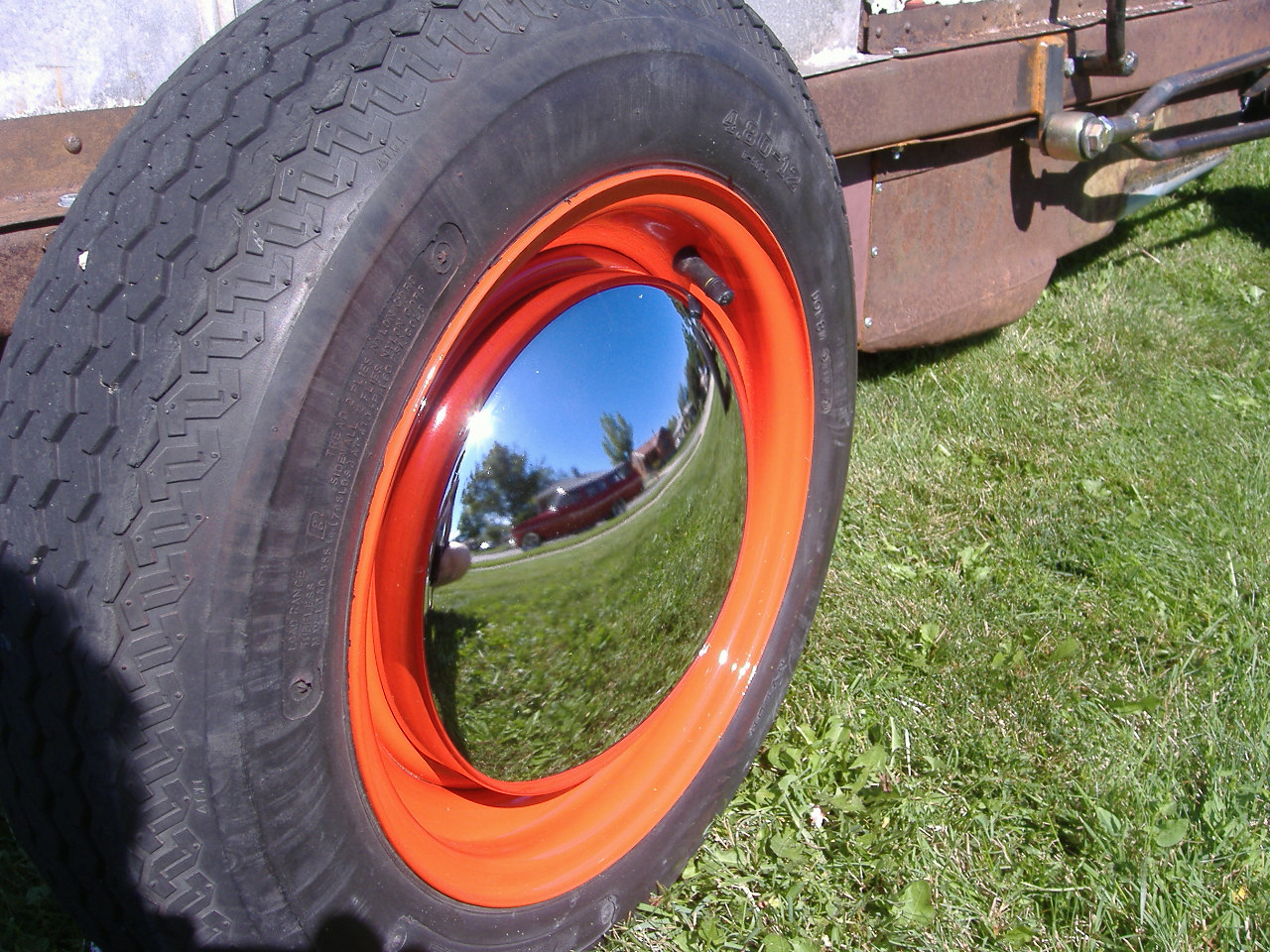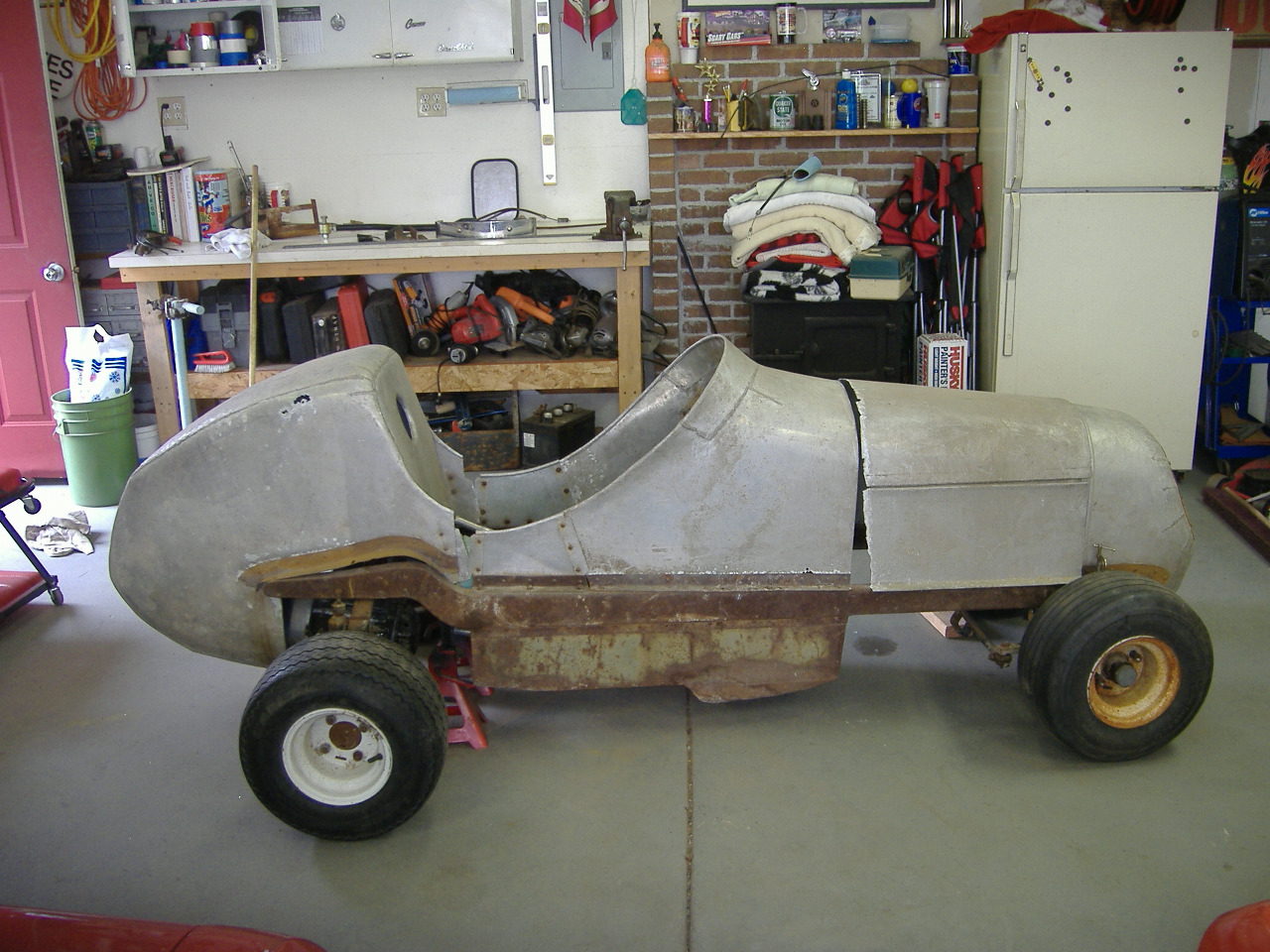 In the last photo, you can see the new tires and rims that I chose. Midget racers of the late ’40s ran on 12″ steel rims and bias ply tires. Trailer tires were the simplest solution to achieving that look. The front tires are slightly smaller than the rears. Much later, I did something about the terribly ugly white spoke wheels by modifying them to hold some baby moon hubcaps. They aren’t exactly midget-correct, but I don’t mind claiming a little artistic license here and there. At this point, the midget pretty much looked like what the finished product would look like. It was getting exciting.