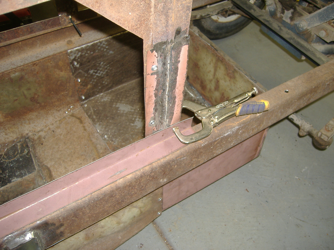 I guess I was tied to the thing with a six inch rope, because I have zero photos of the whole unit. Anyway, the long runners on the bottom of the unit were completely shot. So, using a piece of sheet metal from a ’37 Ford roof I had been saving and my new 36″ sheet metal brake from Harbor Freight, I built some new runners for it to sit on. The uprights were rotted pretty bad, so I patched them up as well. The photos below show some of that process.