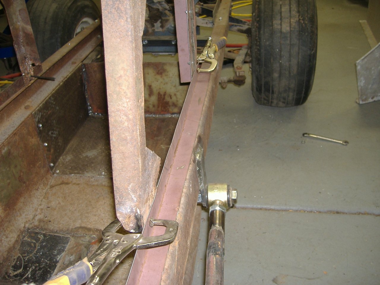 The midget came with a dash/cowl reinforcement structure, which was badly rusted away. Unfortunately, I didn’t take any good photos of the rust damage before. (Actually, I didn’t even take any bad photos of it.) You can sort of get an idea of what it looks like in the following shots. (Interesting side note: All of the midget’s body and frame is hand built, so as I worked on it, I could see the welds and the bends and hammer marks that some fabricator made 70-some years ago.)