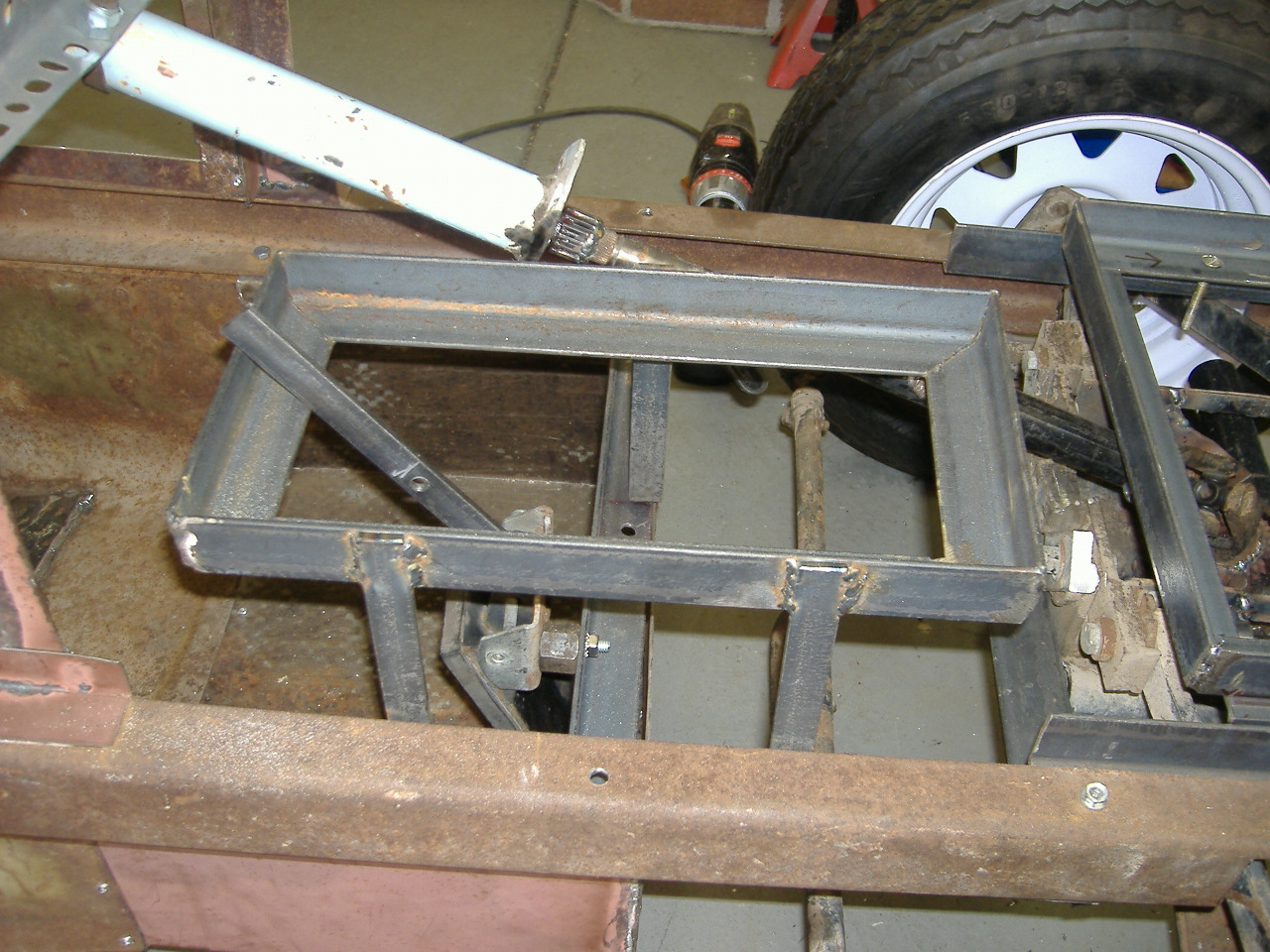 Now that we had brakes, we needed a reason for their existence. Power. This really was exciting. All we had to do now was add electricity and the midget would be on the road. First, we needed a place to keep the batteries. The golf cart had used 6 6-volt batteries, but there was no way that many batteries would fit in the midget, so I went with 3 12-volt batteries. It was very difficult to find a place for even that few. I wanted them on either side of the steering column, but due to the hinging of the hood, only one would fit. Another was placed in the nose cone, and the last one was squeezed in between the seat and the rear diff.
