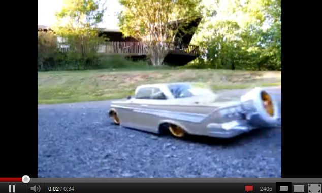 This is a video of a radio control ’61 Impala low-rider with functional hydraulics. It is just about as cute as anything. It rides on a scratch-built brass frame and it does all the standard low-rider moves.