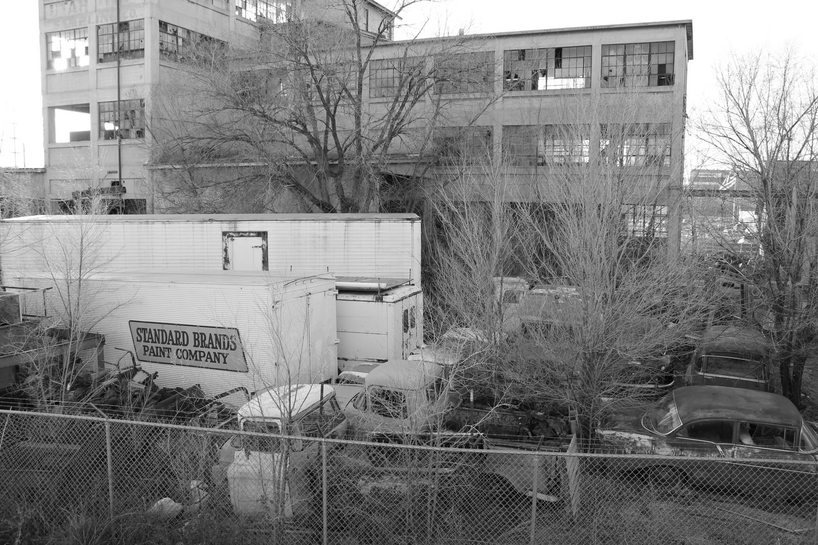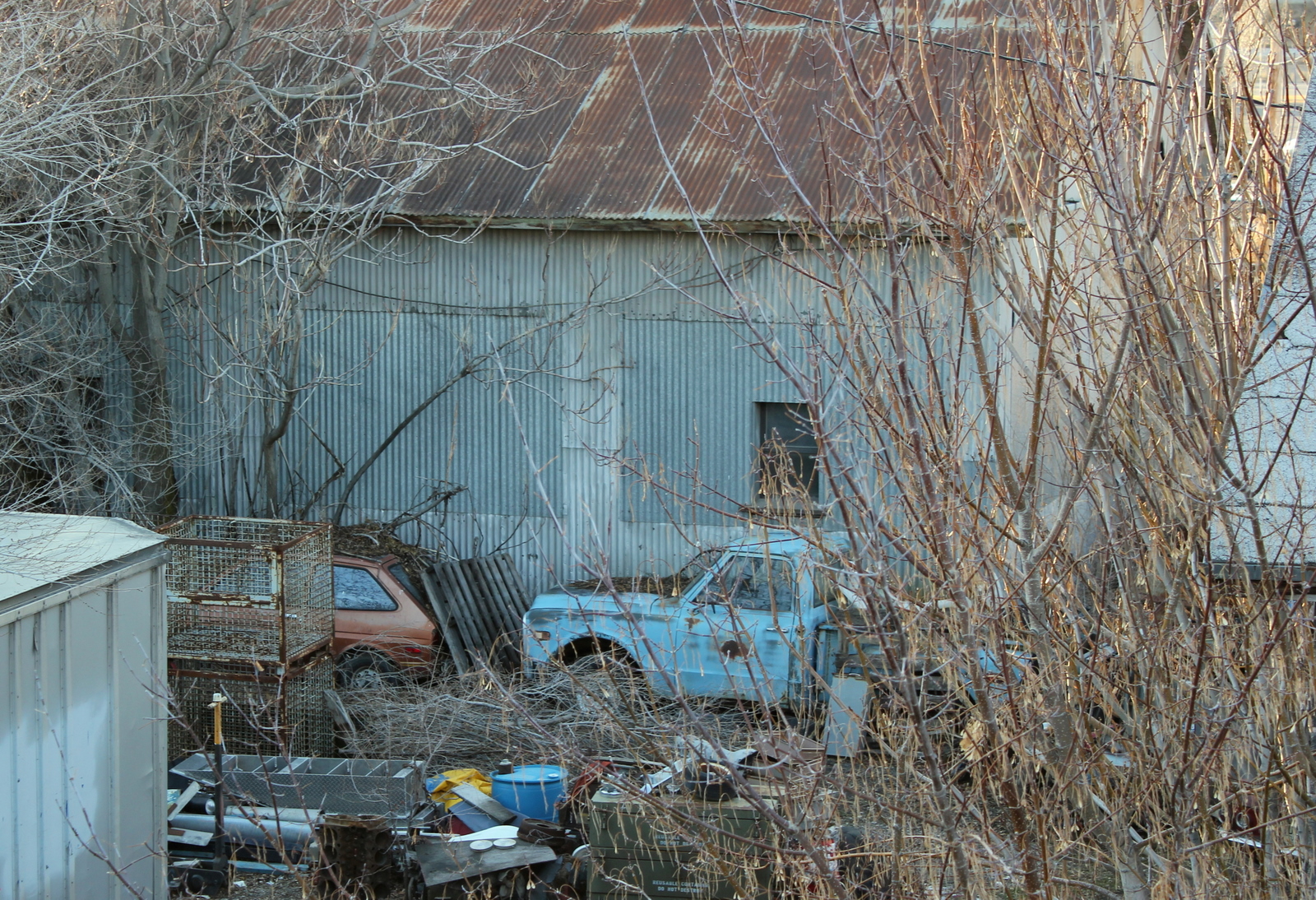 I have intended to shoot this building and yard for some time now.  It is quite a collection of old cars, old buildings, old work trucks, and plain old stuff.