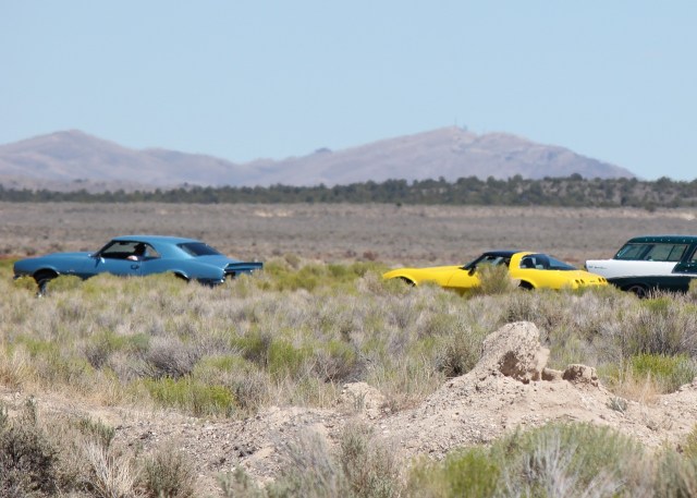 It is very rare to see these creatures in the wild. Here, a lucky photographer was able to snap a shot of three General Motors products cavorting in a barren, desert habitat. In the photo, you see a 1968 Camaro, 1978 Corvette, and 1956 Nomad all seemingly coexisting peacefully. A peacefulness that will quickly evaporate should an attractive Saturn Sky drive by.