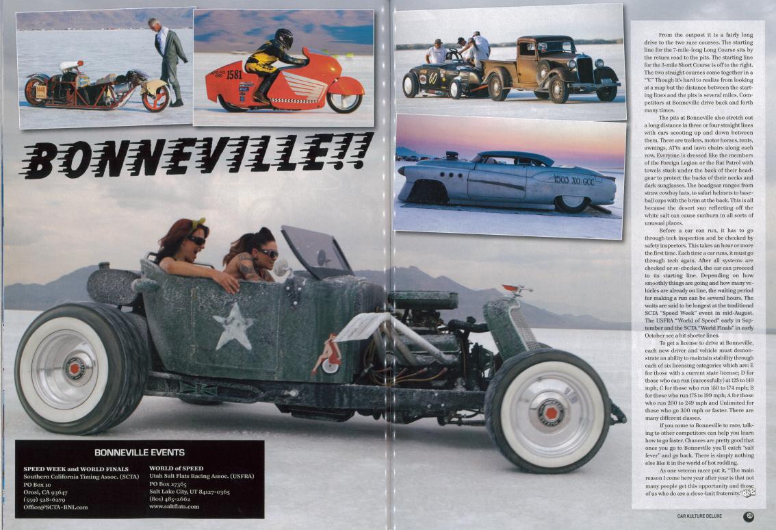 In August of 2012, a group of friends and I attended Speed Week at the Bonneville Salt Flats. That group had hooked up with accomplished pin-up photographer Mitzi, who took some great shots some of our pin-up gals with our cars. The results were fantastic. The folks at Car Kulture Deluxe must have thought so too, as they picked up a couple of the shots for their spread about Speed Week.